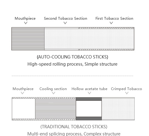 Along with China Tobacco Group in Henan, we have successfully developed a new kind of self-cooling HNB tobacco sticks and obtained corresponding patents. In the new structure, the tobacco section is divided into the first and the second tobacco sections, with the latter lies between the first section and the filter. During a smoking session, only the first tobacco section is heated. High-temperature aerosols pass through the second tobacco section and heat up the aerosol-generating materials in this section. While more aerosols are generated, the high-temperature aerosols are cooled down before entering the filter section. This new approach simplifies the HNB tobacco stick structures and lowers the manufacturing costs. Further, it enables manufacturers to utilize existing machinery that make traditional cigarettes to make HNB sticks, thus achieving significant cost-savings for transitioning to new tobacco technologies.