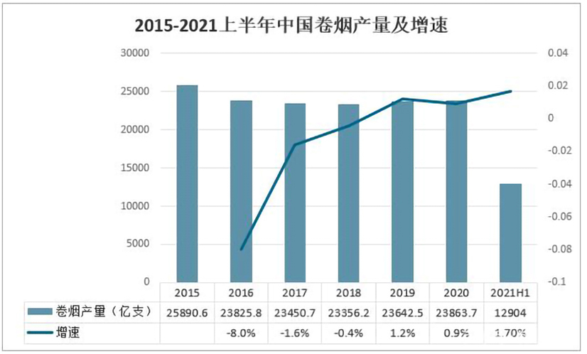 卷烟用卷烟纸将烟丝卷制成条状的烟制品,又称纸烟、香烟、烟卷。有滤嘴卷烟和无嘴卷烟,又有淡味和浓味之分。2021上半年中国卷烟产量为129.04亿支,同比增长1.7%。