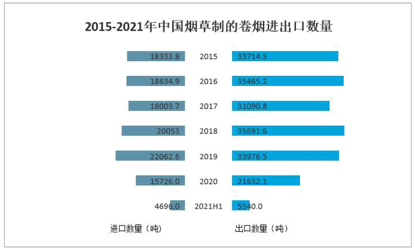 智研咨询发布的《2021-2027年中国烟草行业市场供需模式及竞争战略分析报告》数据显示:随着经济发展和支出增加,居民消费水平不断提高,香烟作为日常必需品也随之水涨船高,全社会烟草消费需求持续增长。2021上半年中国烟草制的卷烟进口数量为4696吨;出口数量为5540吨。