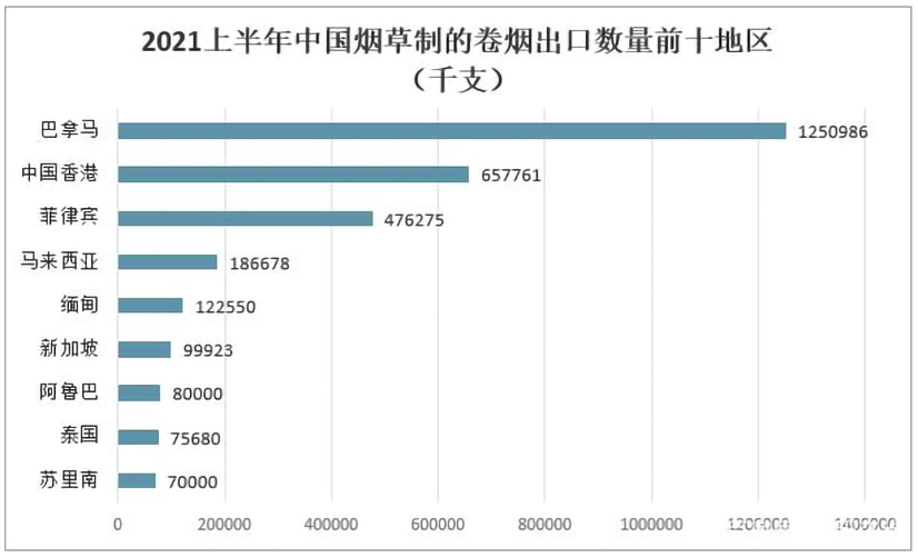 其中2021上半年中国烟草制的卷烟出口数量最多地区为巴拿马1250986千支;其次是出口至中国香港地区烟草制的卷烟数量657761千支。
