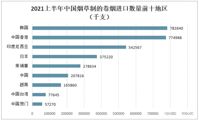 其中2021上半年中国烟草制的卷烟进口数量最多地区为韩国782640千支;其次是从中国香港进口烟草制的卷烟数量774988千支。