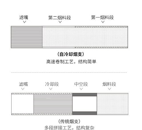 加热不燃烧烟草制品为降低烟气在滤嘴处的温度,传统的解决方式,也是某个大型烟草公司拥有专利的方法,是在烟支中设置一降温段,将烟料段与滤嘴相间隔,使烟料段产生的烟气在降温段得到降温,再通过滤嘴流出。